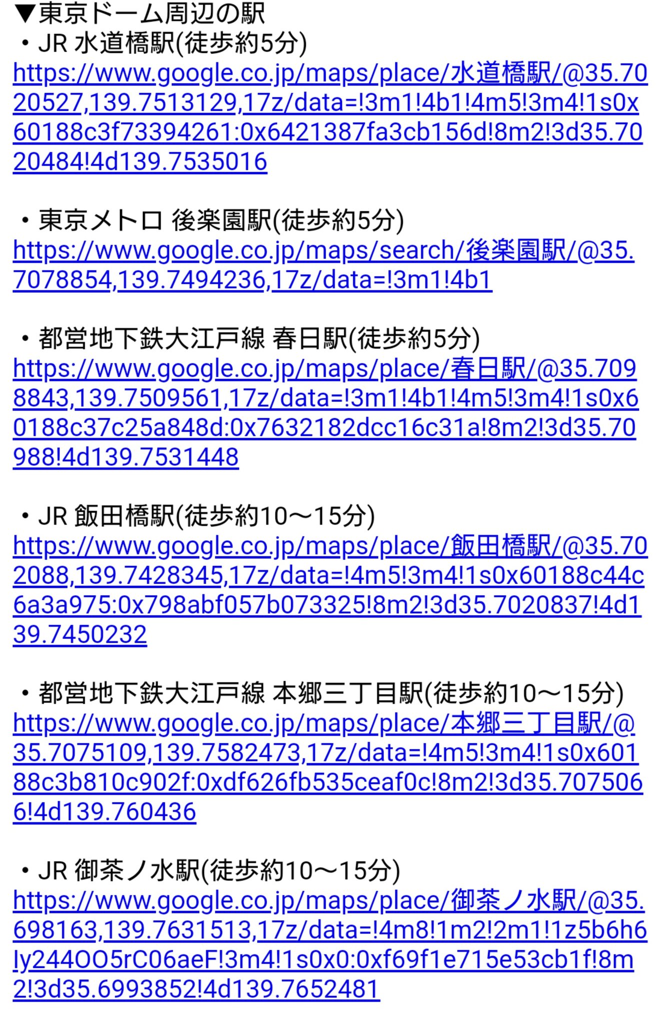 Saki Ldhってば 東京ドームの帰りの電車を分散させるために 東京ドーム から歩ける駅を一覧で送ってきてくださってるんだけど 歩ける距離にこんなにたくさん駅があること自体 東京ってすげぇな って感動したよ 水道橋 後楽園 春日 飯田橋 本郷